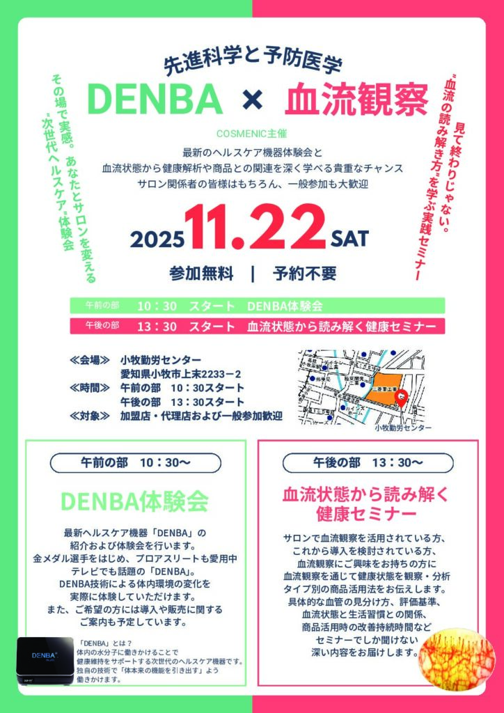 セミナー情報, 新着情報「DENBA体験会」および「血流観察セミナー」のお知らせ 2025年11月4日 平素よりCOSMENICをご愛顧いただき […] 「DENBA体験会」および「血流観察セミナー」のお知らせ Read Post »
